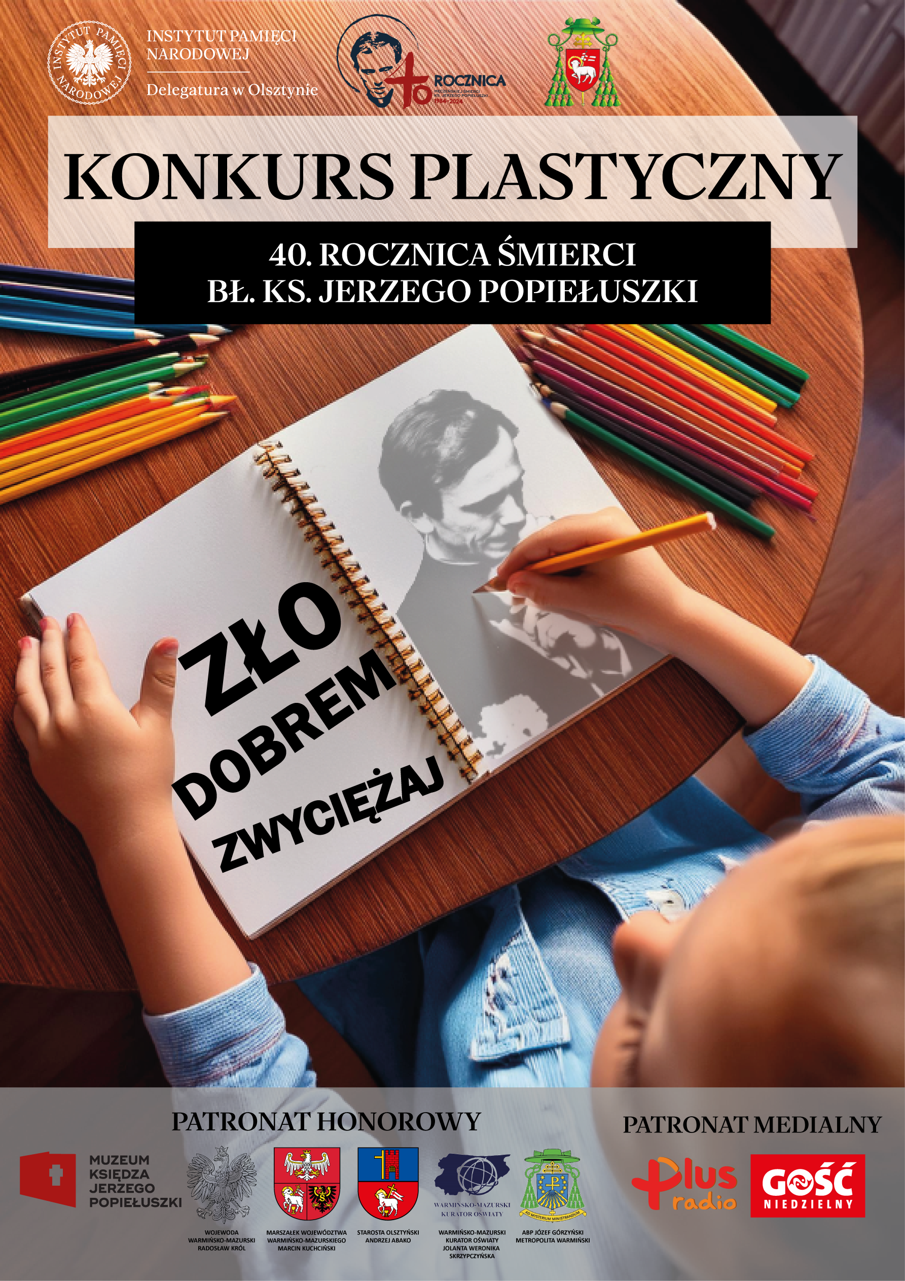 Z okazji przypadającej w tym roku 40. Rocznicy śmierci błogosławionego księdza Jerzego Popiełuszki Delegatura Instytutu Pamięci Narodowej w Olsztynie we współpracy z Wydziałem Nauki Katolickiej Kurii Archidiecezji Warmińskiej zaprasza uczniów szkół podstawowych oraz ponadpodstawowych do udziału w konkursie plastycznym „Zło dobrem zwyciężaj”.