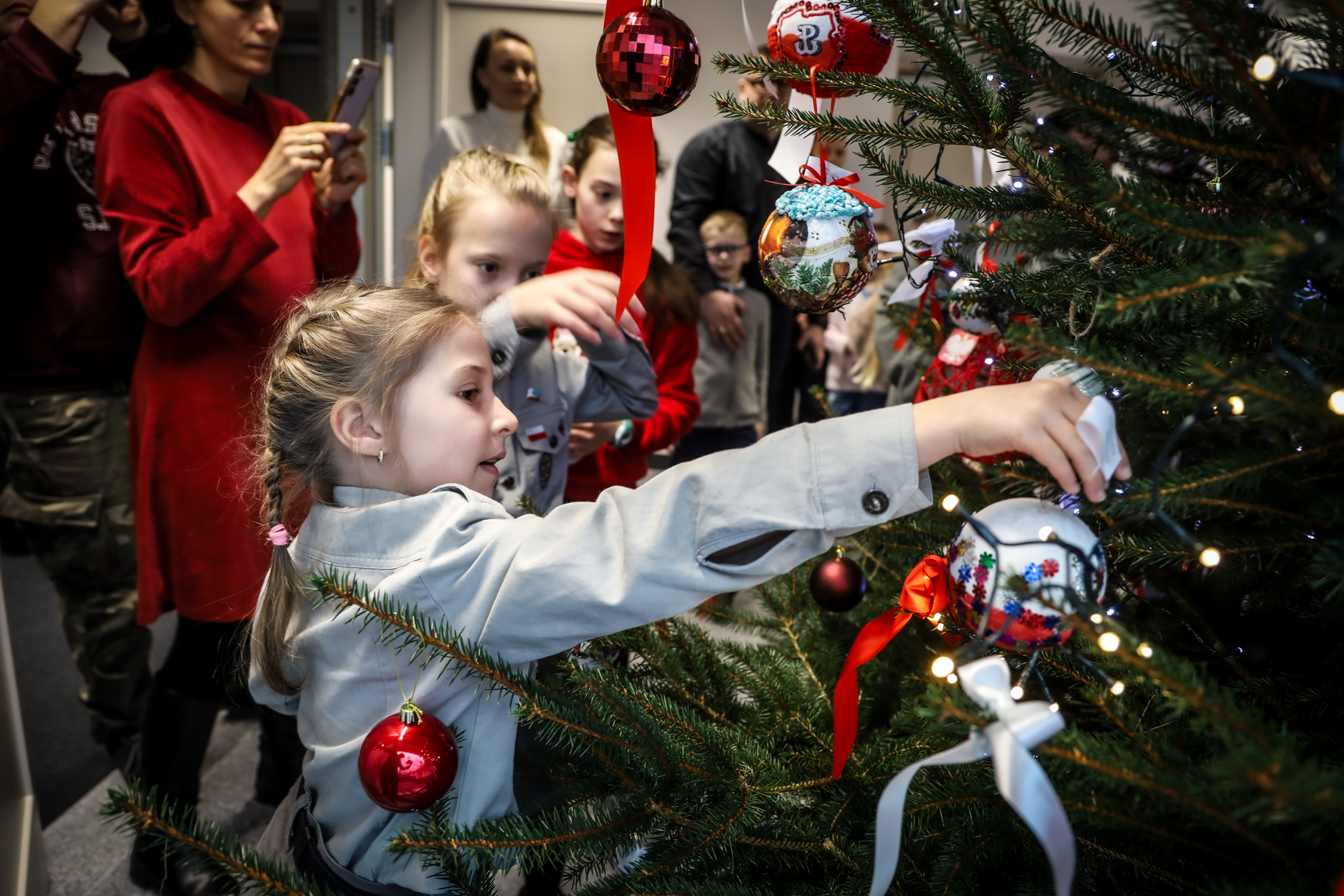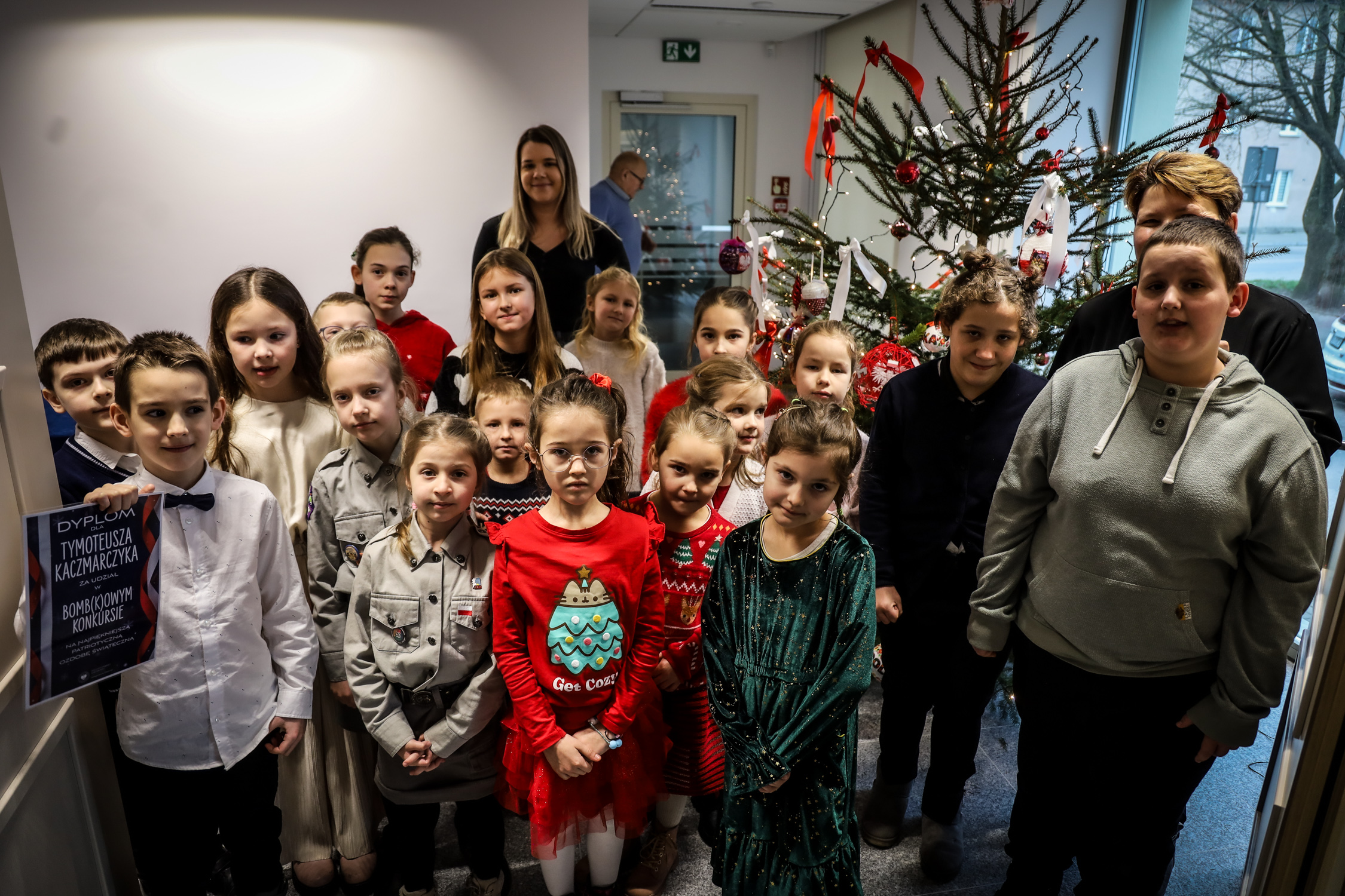 Uczestnicy konkursu wspólnie przystroili konkursowymi ozdobami choinkę, każdy otrzymał również upominek.
