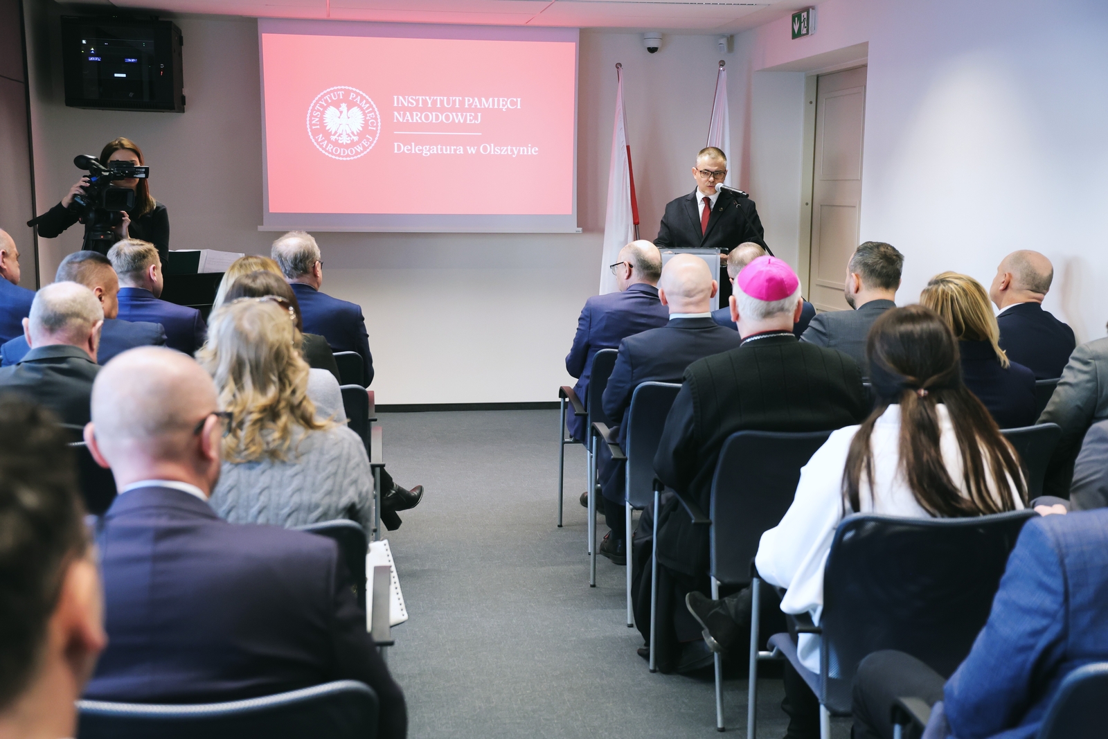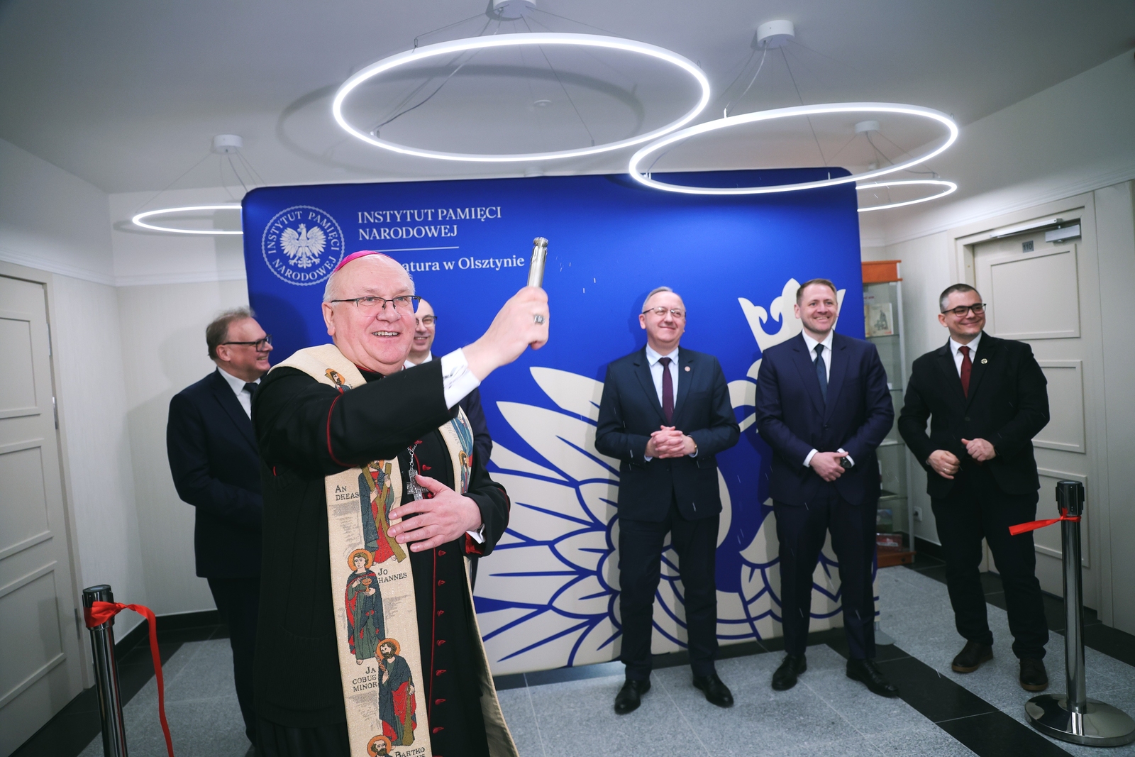 W uroczystości otwarcia nowej siedziby olsztyńskiej Delegatury Instytutu Pamięci Narodowej w Olsztynie wzięli udział zastępcy prezesa Instytutu: dr hab. Karol Polejowski i dr Mateusz Szpytmam dr hab. Krzysztof Sychowicz, przedstawiciele Biur, Oddziałów i Delegatur Instytutu Pamięci Narodowej, a także przedsatwciele władz samorządowych, służb mundurowych, instytucji, stowarzyszeń oraz działaczy niepodległościowych.